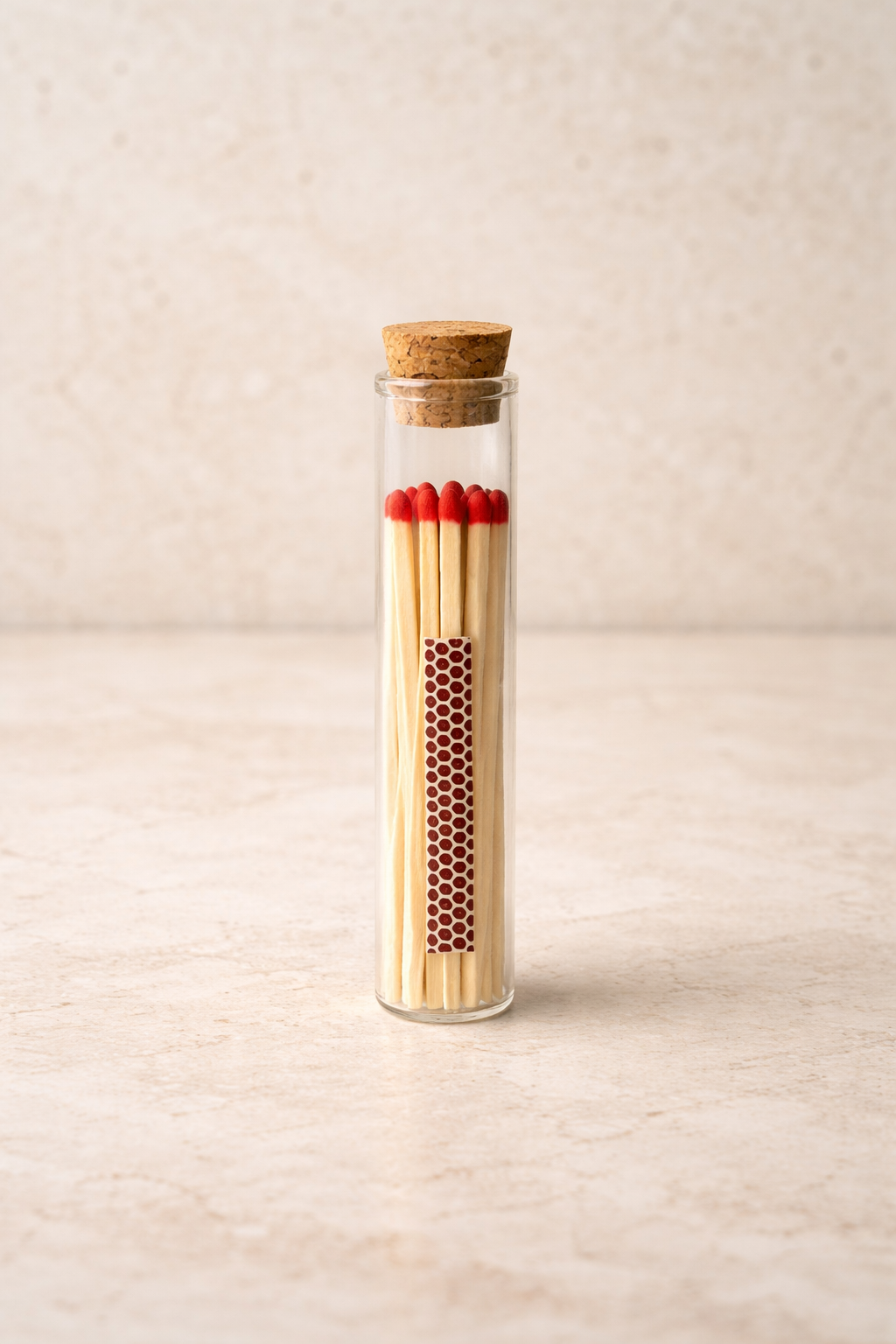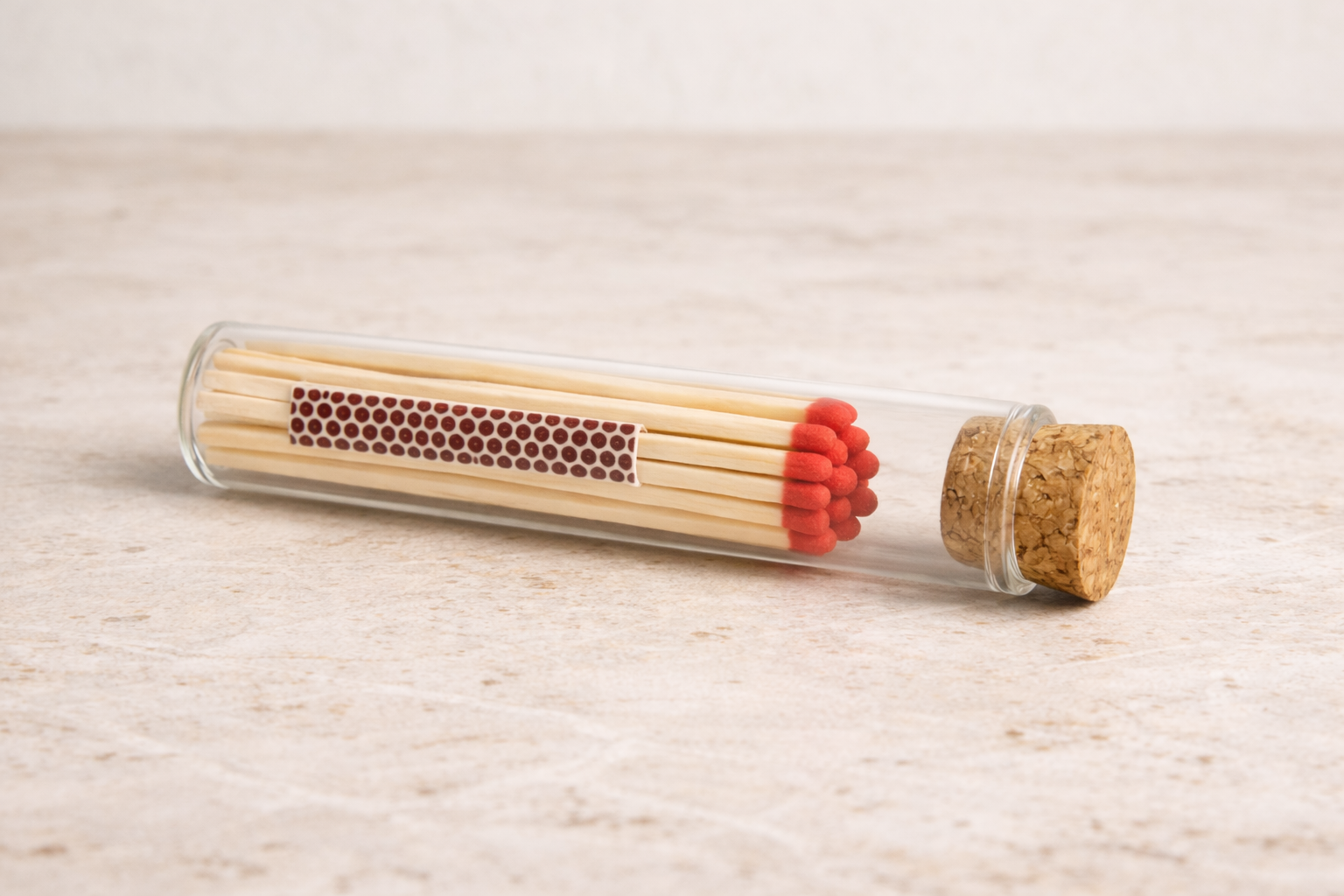 בקבוק זכוכית מעוצב עם גפרורים ארוכים ונאטם בפקק שעם.