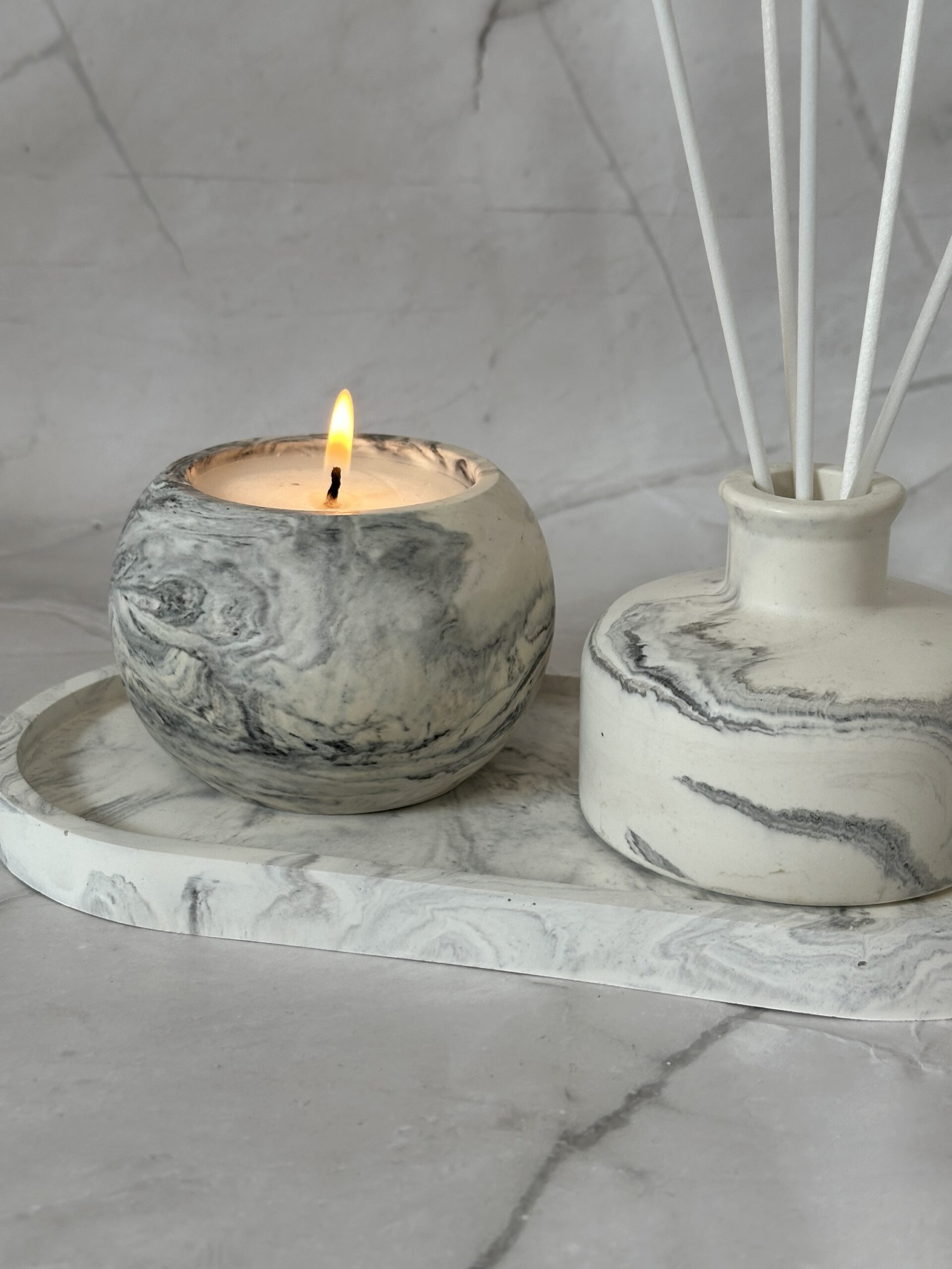 תנו למרחב שלכם מגע של אלגנטיות עם מארז דיימונד הייחודי שלנו הכולל אגרטל, נר ומגש ייחודיים בעבודת יד. שלושת הפריטים עשויים מבטון איכותי בצבע לבן עם נגיעות אפור ושחור ומשלבים עיצוב מודרני עם חמימות טבעית.