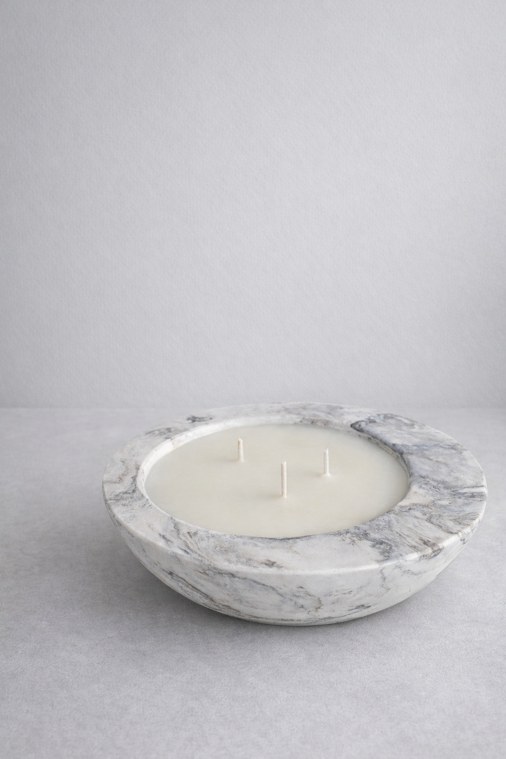נר ריחני גדול, מרשים ואלגנטי עשוי מתערובת שעוות טבעיות איכותיות על בסיס שעוות סויה ללא פראפין בקערת בטון גדולה בצבע לבן עם נגיעות אפור