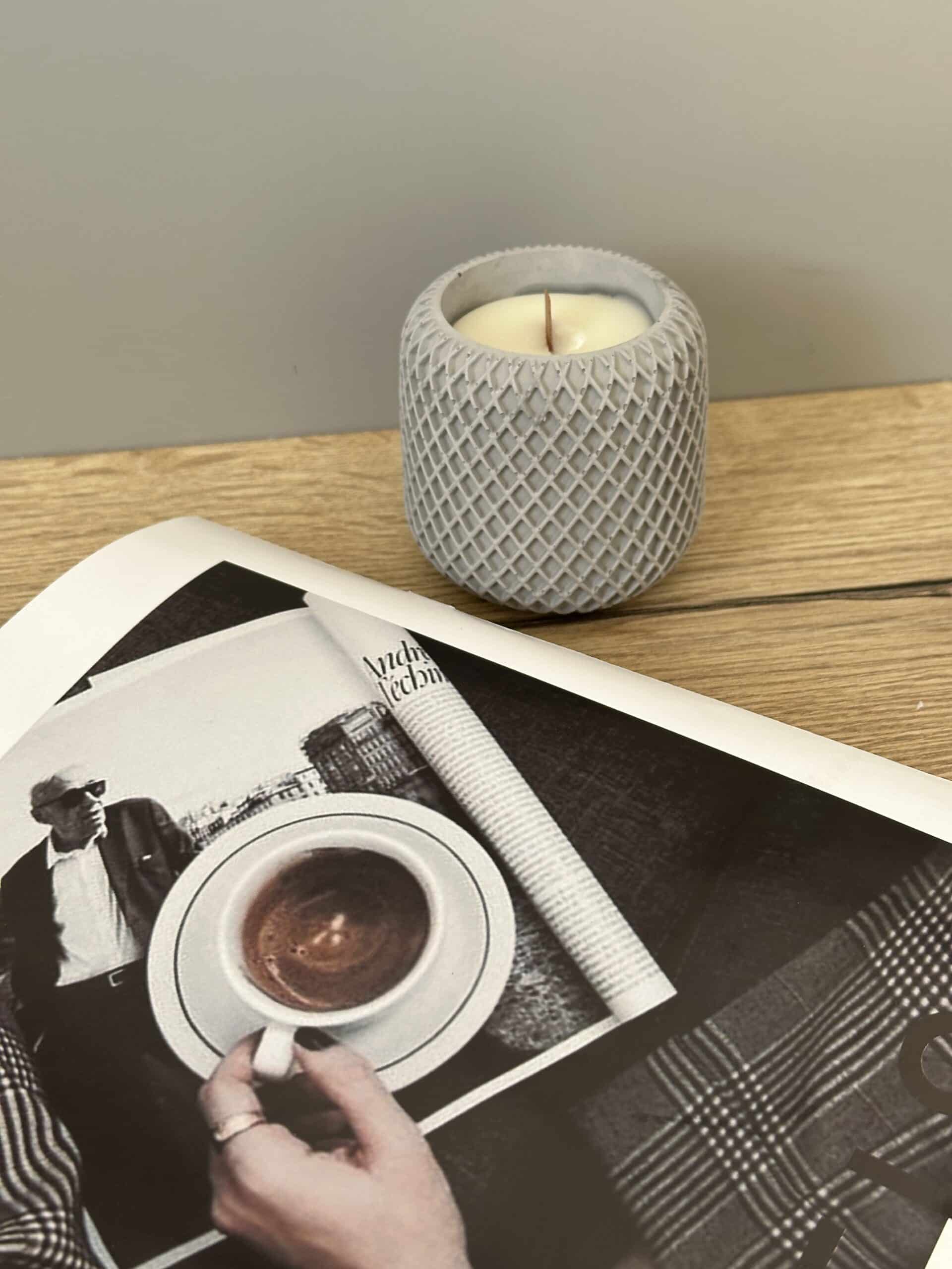 נר מיוחד ואלגנטי עשוי מתערובת שעוות טבעיות איכותיות על בסיס שעוות סויה ללא פראפין בכלי מבטון מעוצב מעויינים