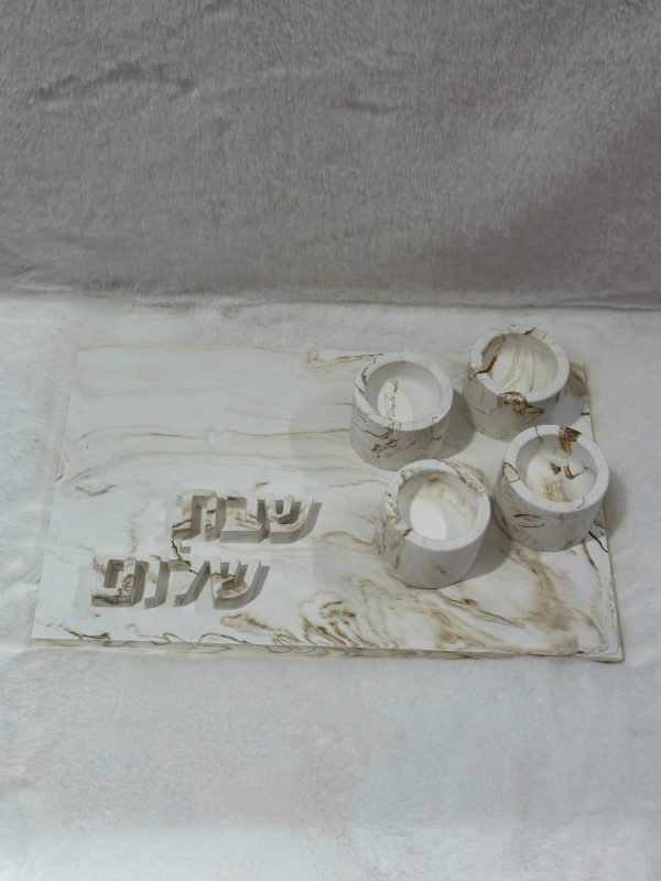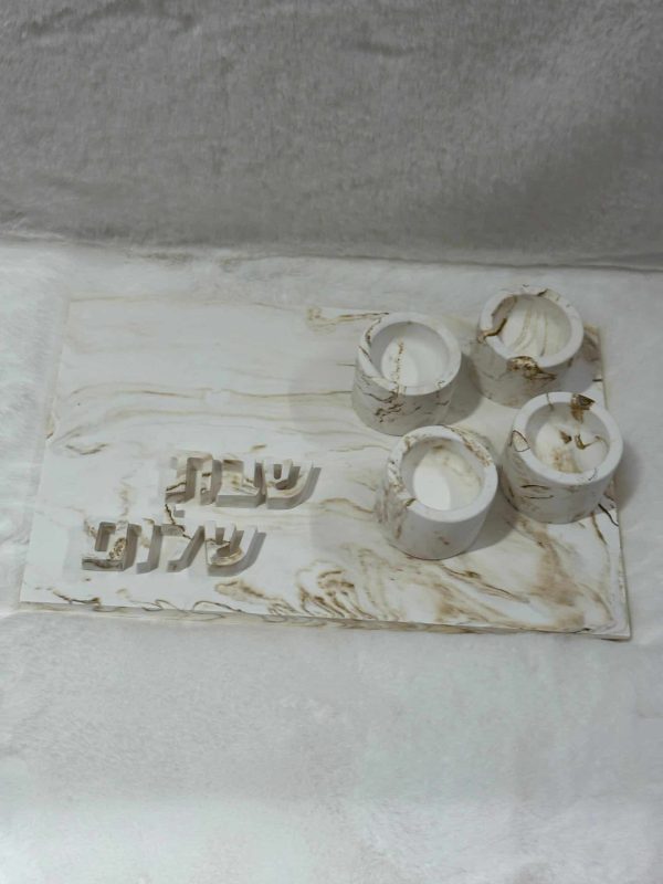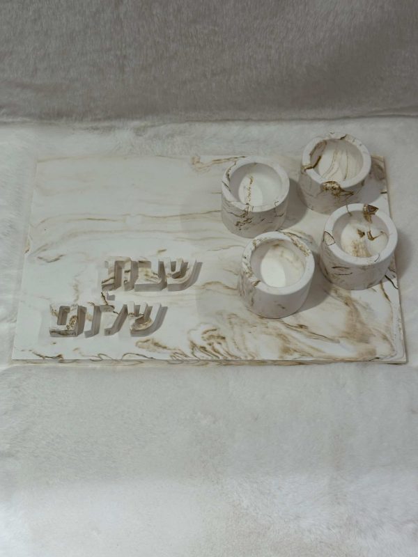 אותיות "שבת שלום" בולטות בחזית המגש, מוסיפות נופך מרגש של ברכה ואיחולים לשבת מתוקה ומוארת.
