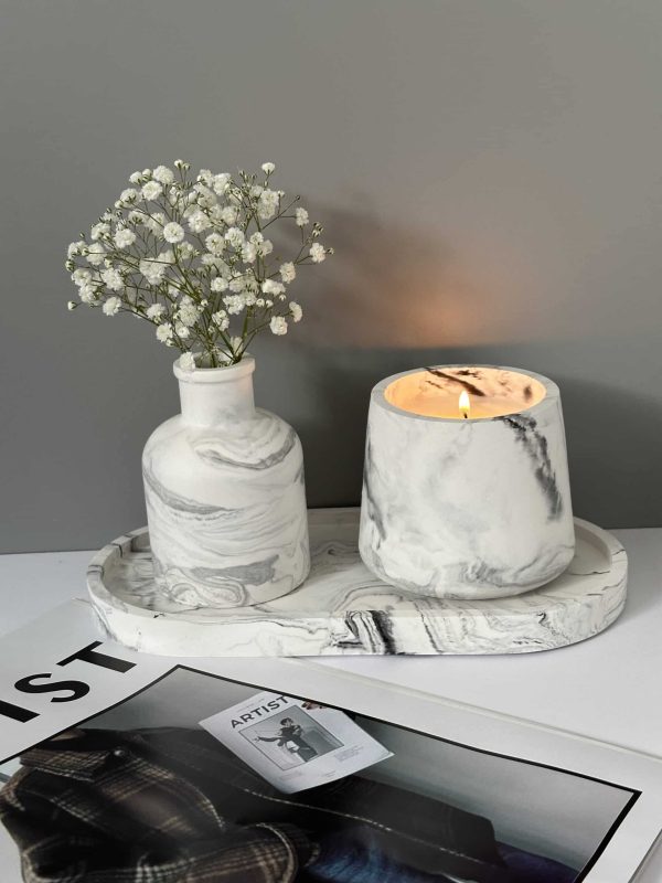 המארז מכיל: נר ביל לבן אפור ושחור | אגרטל איזבלה לבן אפור ושחור | מגש מולאן לבן אפור ושחור| 2 מקלות בצבע לבן