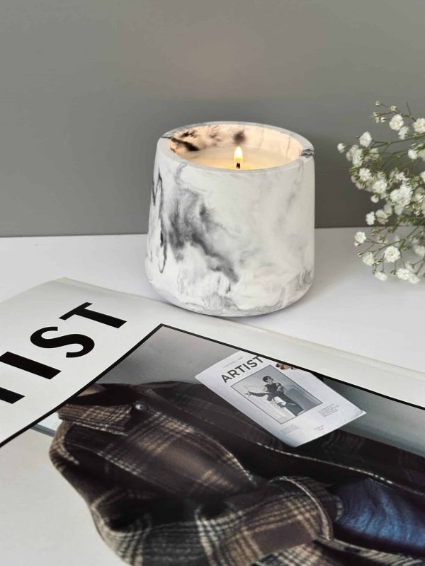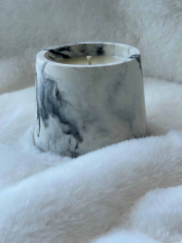 נר ריחני ואלגנטי עשוי מתערובת שעוות טבעיות איכותיות על בסיס שעוות סויה ללא פראפין בכלי בטון בצבע לבן עם נגיעות אפור