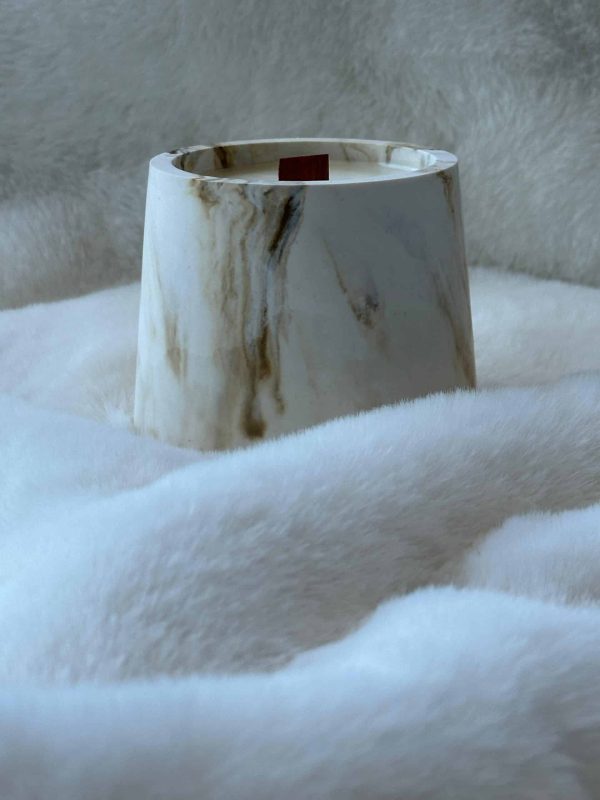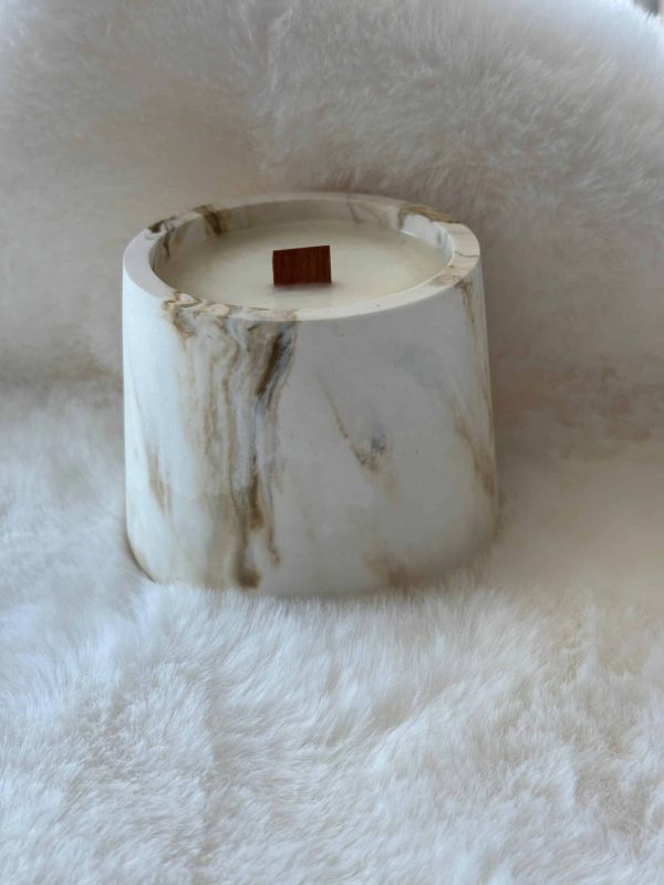 נר ריחני ואלגנטי מתערובת שעוות טבעיות איכותיות על בסיס שעוות סויה ללא פראפין, בכלי בטון בצבע לבן עם נגיעות שמנת