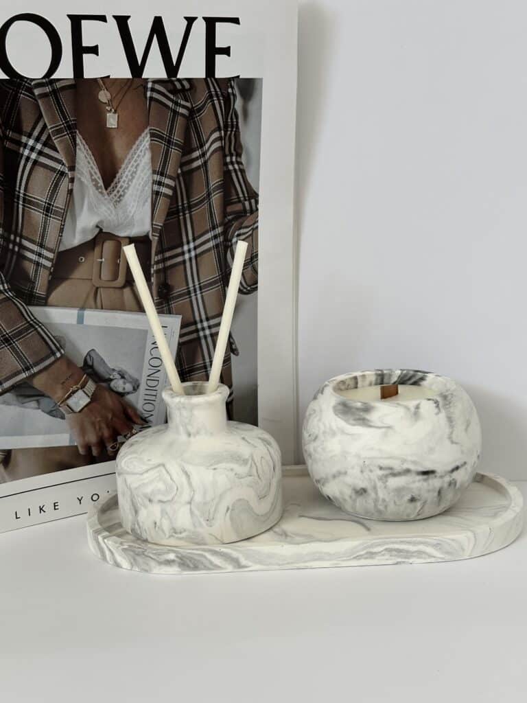 נר ריחני ואלגנטי משעוות סויה טבעית בכלי בטון בצבע לבן שמנת וחום