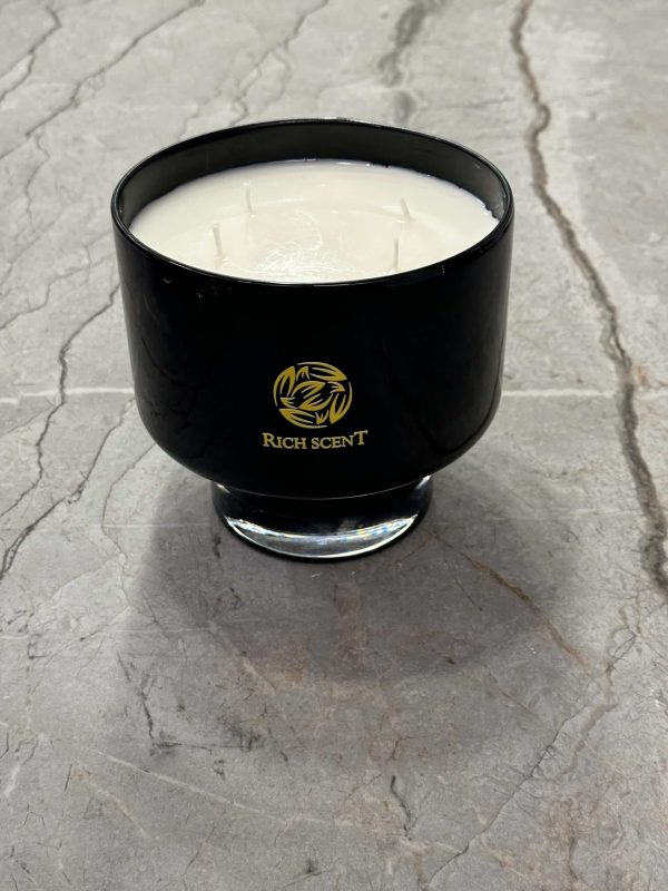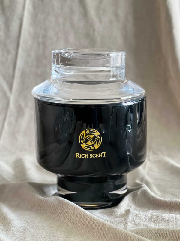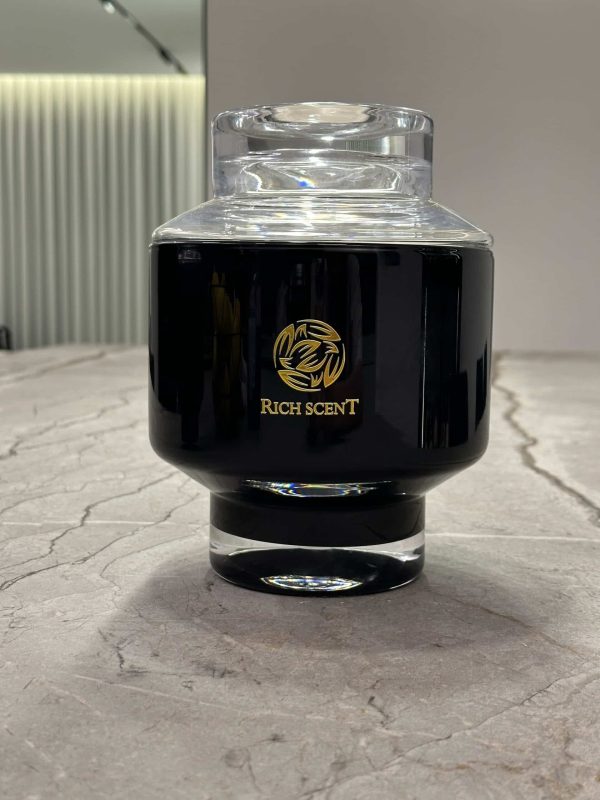 נר דיקסון בכלי זכוכית שחור יוקרתי וגדול המשדרג ומוסיף יוקרה ונוכחות לחלל בו הוא מונח.